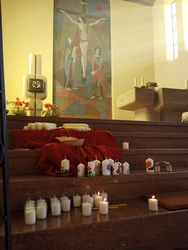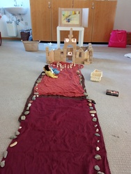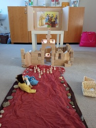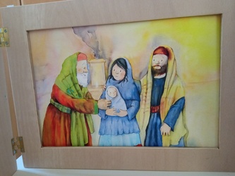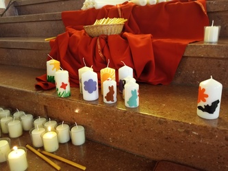 Die Gruppe der Kinder hörte auch von Simeon und seiner Begegnung mit dem 40 Tage alten Jesus. Dadurch inspiriert bauten sie aus Holzklötzen, Steinen, Tüchern und Figuren einen Tempel und ließen die Heilige Familie dort einziehen. Da der zweite Februar der Tag der Kerzenweihe ist, konnte sich jedes Kind im Anschluss an die Geschichte aus der Bibel eine eigene Kerze gestalten.