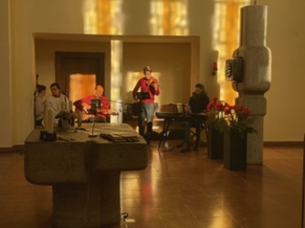 Musiker und Ministranten begaben sich in die Kirche, um für die gemeinsame Messfeier zu proben.