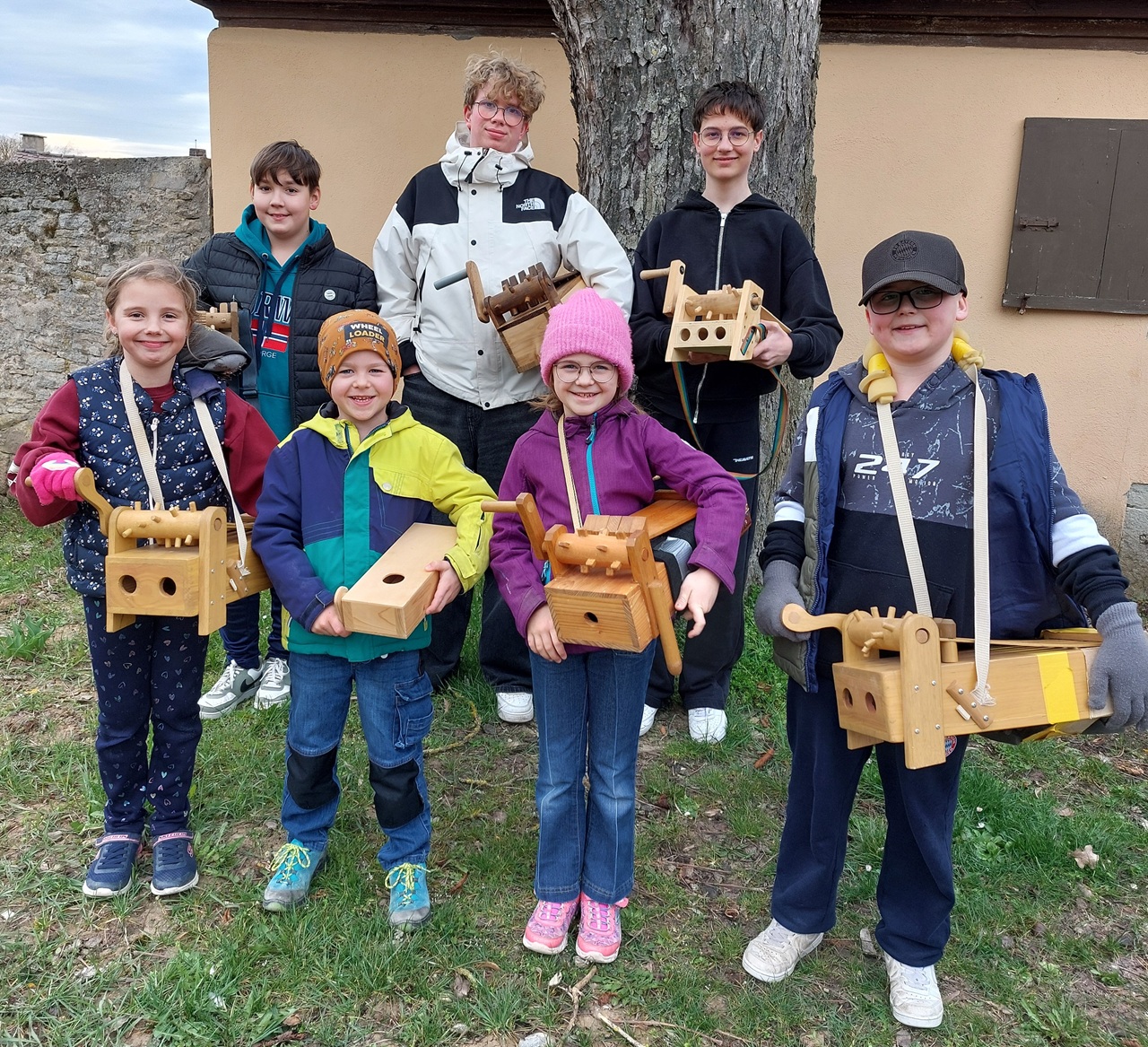 Rappeln, ratschen, rumpeln, kerren, klappern... , obwohl sich z.T. die Begrifflichkeiten und die Gerätschaften in den einzelnen Ortschaften unterscheiden, ist die Tradition, die dahinter steht, dieselbe: an den Kartagen verstummen die Glocken der Kirche und werden durch rhythmisches Holzklappern ersetzt. So auch in Allersheim, wo sieben Kinder am Karfreitag und -samstag mit ihren Rappelkästen unterwegs waren, um mit jeweils passenden Sprüchen die Gläubigen an die Leidensgeschichte zu erinnern und zum Gebet aufzurufen. Als Dank für ihren Einsatz wurden die Kinder mit reichlich Süßigkeiten und Geldspenden von den Allersheimern belohnt.