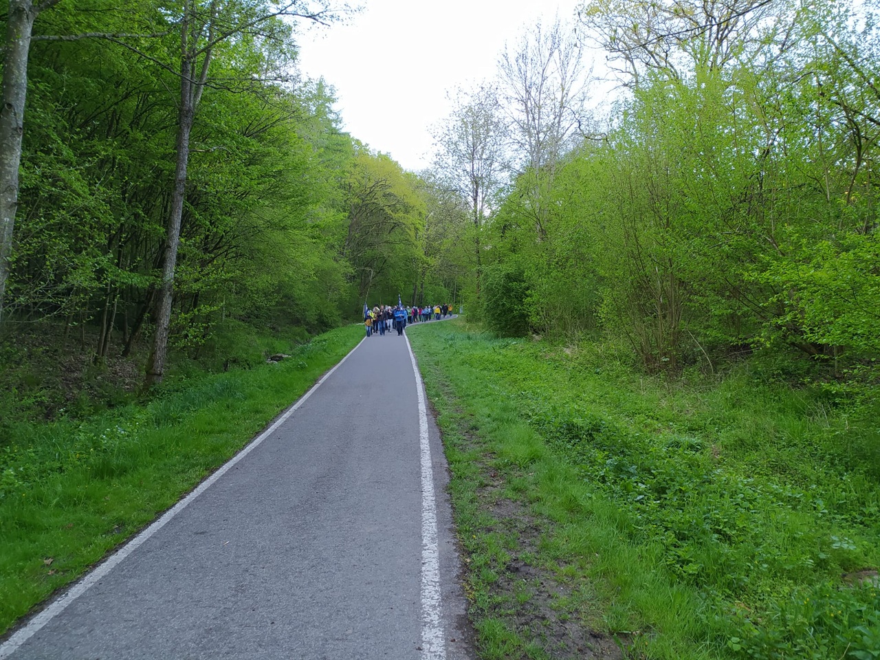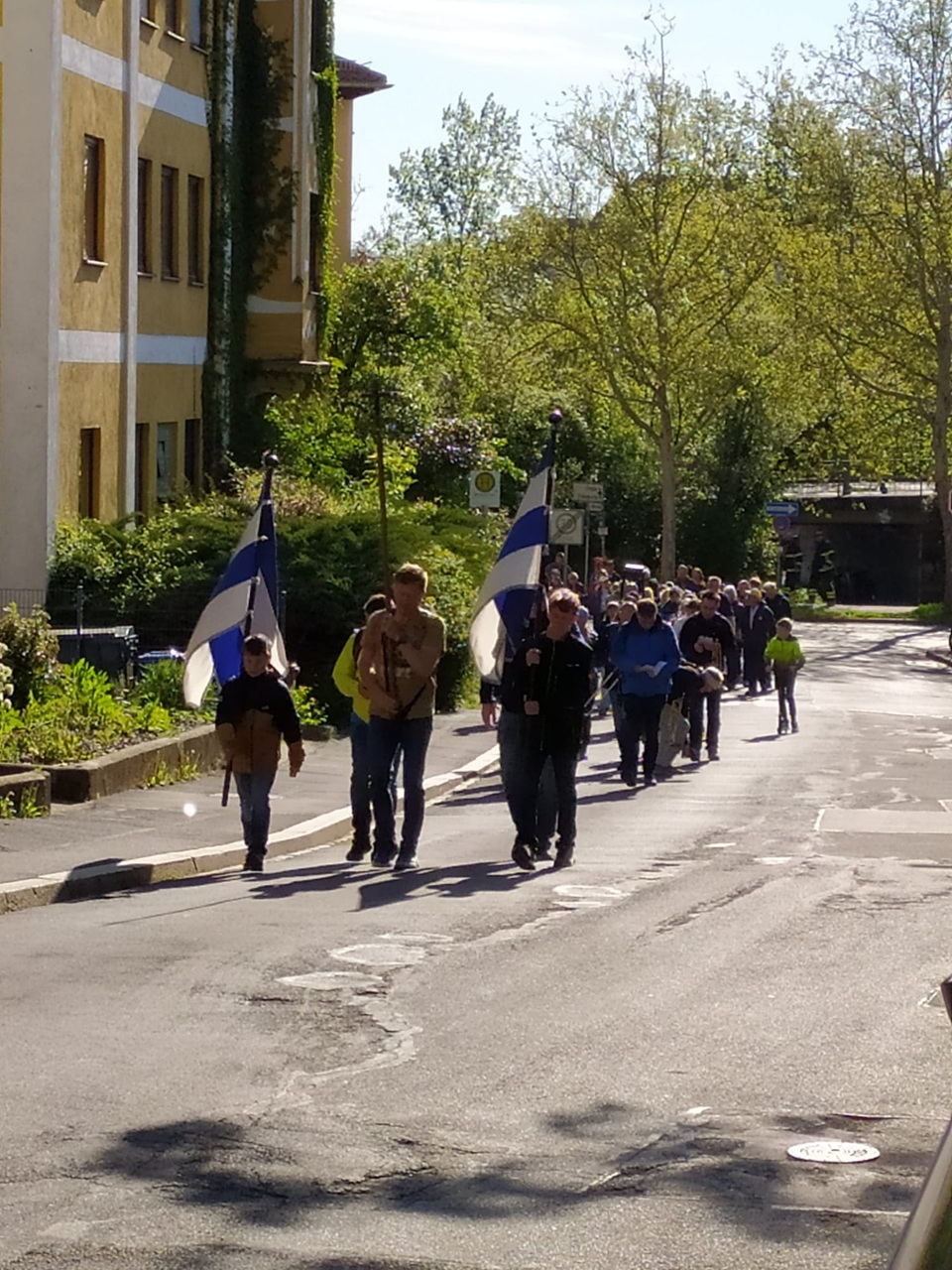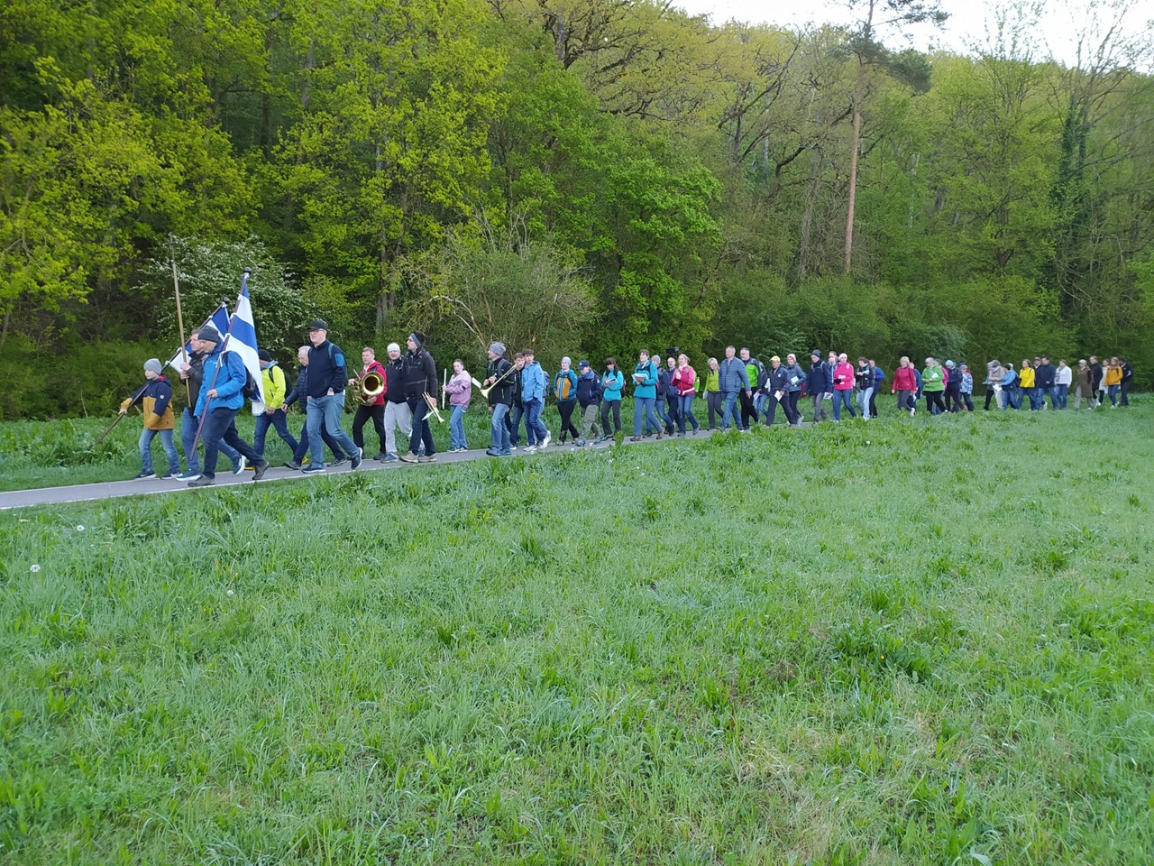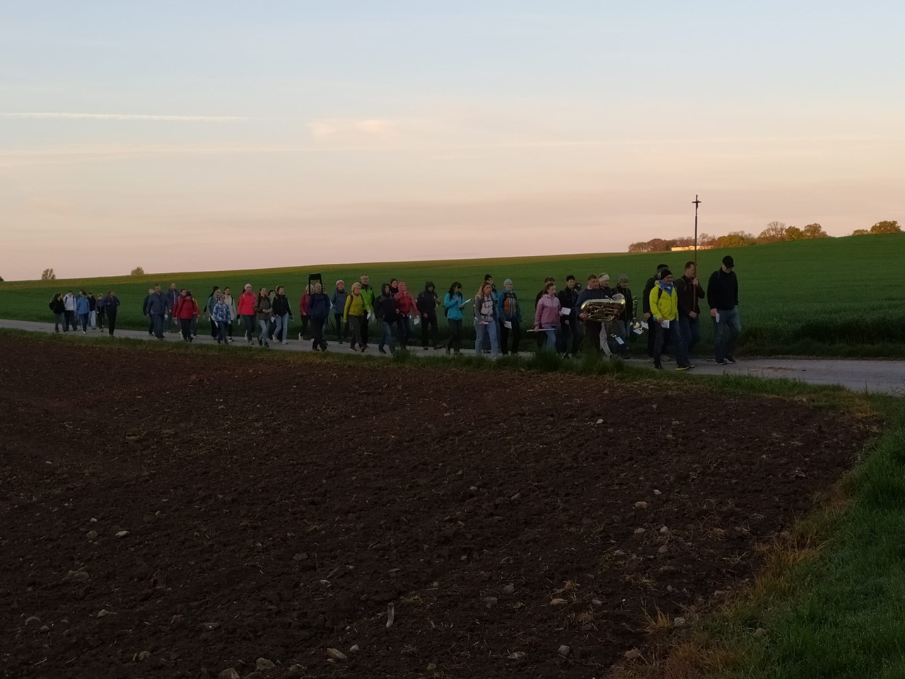 Bei frischen Temperaturen von weniger als zehn Grad trafen sich warm angezogene Wallfahrer aus Essfeld und Umgebung an der Kirche St. Peter und Paul in Essfeld. Nach dem Pilgersegen machten Sie sich begleitet von Essfelder Musikanten auf den Weg nach Würzburg. Ab Fuchsstadt sorgte die Essfelder Feuerwehr für die Sicherheit auf den Straßen. In Rottenbauer stießen weitere Wallfahrer mit Ihren Fahnen hinzu. Nach der Pause kurz vor Heidingsfeld ließen es die Temperaturen sogar zu, dass sich manch einer der Mütze oder Jacke entledigte. So erreichten 72 Pilger pünktlich zum Gottesdienst das Käppele.